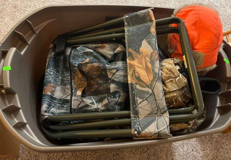 Comprehensive outdoor hunting gear set featuring multiple camouflage apparel pieces from Field & Stream, including a medium lightweight jacket and insulated pants (polyester shell and nylon lining). Also includes two pairs of boots, one labeled Field & Stream size 11 with Thinsulate insulation, and another size 10.5 High Ridge design. Additional items include an orange trapper-style hat with faux fur lining and a foldable camouflage stool with a metal frame.