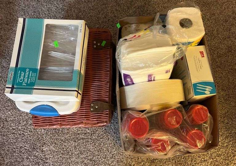 A wicker basket containing disposable tableware such as spoons, forks, plates, and cups from brands like Meijer and CVS. Also included is a plastic storage bin with additional utensils and a box containing paper plates, paper towels, plastic lids, and red-capped condiment bottles.