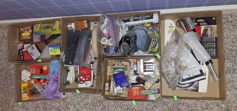 Boxes containing assorted tools, hardware, and household supplies. Includes items such as a paint scraper, light bulbs, plumbing components, cleaning sponges, extension cords, adhesive materials, fasteners, and batteries. Includes both individual items and unopened packaging.