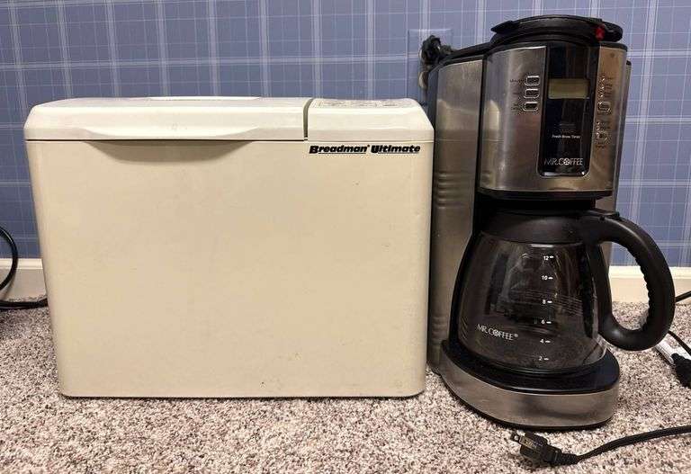A Breadman Ultimate TR2200C bread maker with control panel for crust control, loaf size selection, and multiple baking programs. Unit is UL-listed for household use. Also features a Mr. Coffee programmable 12-cup coffee maker with digital controls, brew strength selector, and reusable filter.