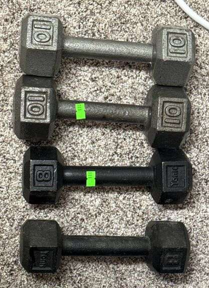 Four dumbbells including two 10-pound hexagonal weights with metallic finish and two 8-pound hexagonal weights labeled with ‘York.’ All feature hexagonal heads with integrated grip handles.