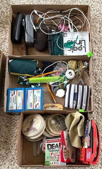 A variety of household, crafting, and entertainment items organized in three boxes. Items include knitting tools (rainbow knit blockers), eyeglass cases, charging cables, a bag labeled ‘Baggu,’ coasters with map designs, small toys including a Transformers activity pad, Monopoly Deal card game, a comb, yarn, and miscellaneous items.