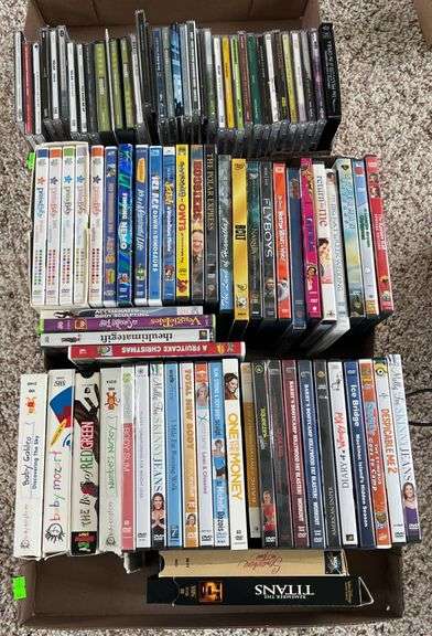 DVDs and CDs, including family-friendly movies such as “Finding Nemo” and “The Polar Express,” as well as music albums by worship artists like Chris Tomlin and Selah. DVDs feature a mix of animated, holiday, and feature films. CDs include various genres, such as Christian worship and orchestral recordings.