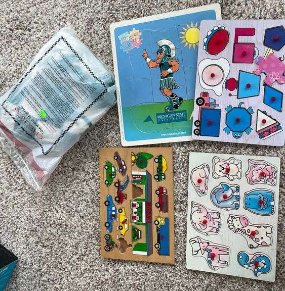 Four children’s wooden puzzles featuring animals, shapes, vehicles, and a creative design with an indigenous theme. Each puzzle consists of multiple interlocking pieces. Also included is a complete checker game set, sealed in its original bag, with playing instructions printed on the packaging.