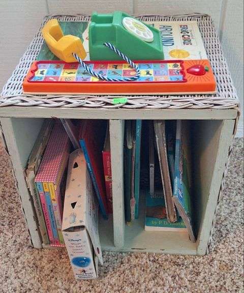 Storage crate with a painted frame and woven exterior design. Measuring approximately 15x14x15 inches. Includes various children’s items, such as books and a toy rotary phone.