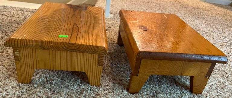 Two small rectangular pine footstools with a natural finish. Each stool features a slatted top and four slightly flared legs with a simple nailed construction. The stools measure approximately 14x9x6 inches.