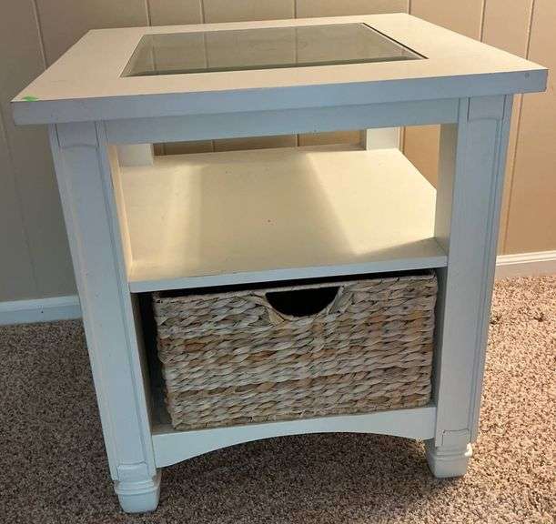 White side table featuring a glass inset top, an open middle shelf, and a removable woven basket that serves as a storage drawer. The table measures approximately 23x23x25 inches. .