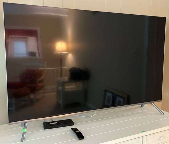 Samsung 55-inch flat-panel Smart TV, model UN55MU8000FXZA, featuring a slim design and silver-tone legs. Includes integrated streaming app support (Netflix, Hulu, etc.), multiple input ports (LAN, USB, HDMI), and 4K Ultra HD resolution. Comes with a matching remote control.