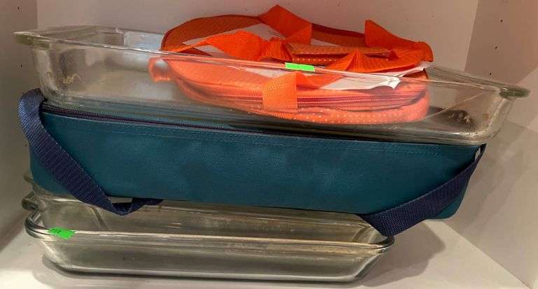 A set comprising three rectangular glass baking dishes with two portable insulated carriers. The carriers include an orange carrier with handles and a zippered teal carrier with a strap. Glass bakeware is clear and stackable.