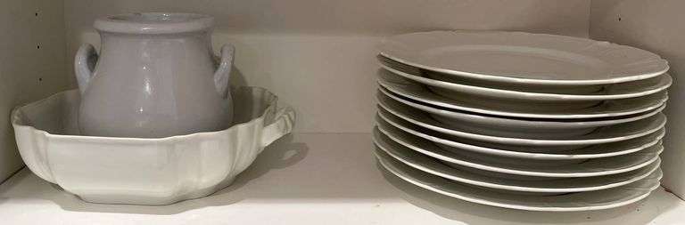 White ironstone dinnerware comprising 8 dinner plates, a handled serving bowl, and a small handled jar. The pieces feature a simple embossed pattern and a glossy glaze finish. Manufacturer marks on the base identify them as ‘Royal Patent Ironstone’ by Burgess & Goddard and ‘H & Co L.’