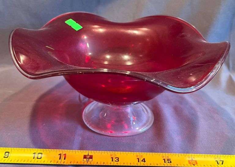 Red glass compote bowl with a ruffled rim and clear pedestal base. Marked ‘Teleflora Gift’ and ‘Made in China.’ Measures approximately 9 1/2 inches in diameter and 4 inches in height. Features a vibrant, translucent red finish.
