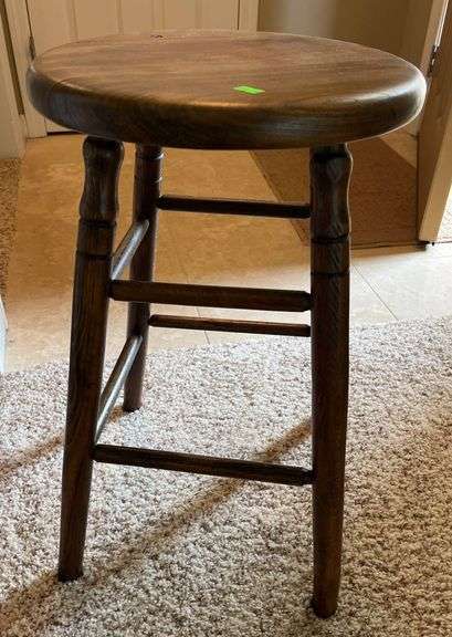 Round backless stool constructed with a solid wood seat and turned wooden legs. Features a circular top and multiple support rungs for added structural durability. The stool measures 24” in height.