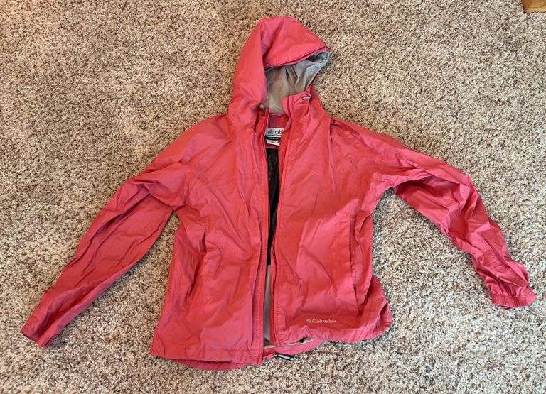 Columbia Sportswear Company’s women’s waterproof and breathable jacket in pink with Omni-Tech advanced performance features. Size large, made in China. Includes a zippered front, an attached hood, and mesh lining for comfort. Columbia branding is visible on the exterior.