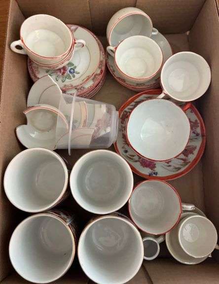 Tea and coffee cups, with accompanying saucers and small plates. Includes handpainted designs featuring floral, geometric, and figure motifs. Some pieces are matched as sets, while others appear unpaired. A portion of the collection shows evident breakage and previous repairs.