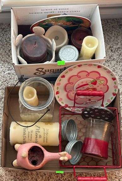 A variety of candles in different colors, shapes, and sizes, housed in glass and tin holders. Includes a painted ceramic object, two metal-framed glass containers, and two decorative plastic plates featuring cartoon designs.