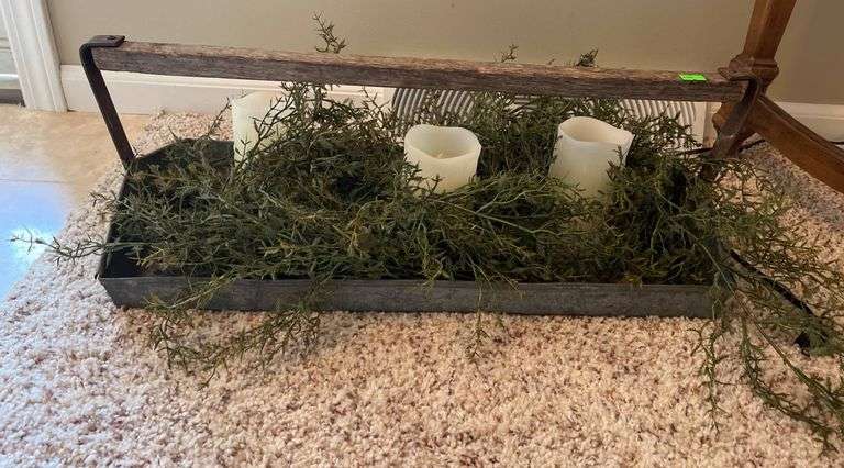 Metal tray measuring approximately 24x11 inches with an integrated handle. Includes faux greenery and three white pillar-style candles as decorative elements. The handle features a rustic-style design, and the tray is rectangular with a galvanized finish.