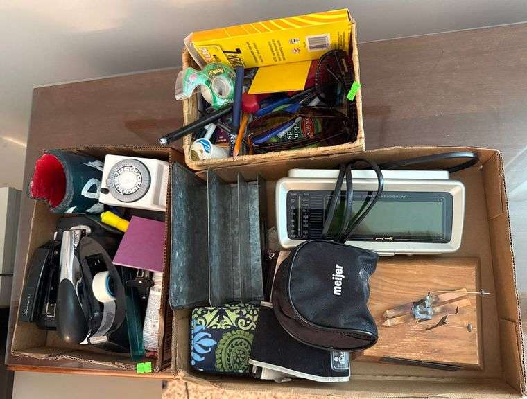 Office supplies and desk accessories, including staplers, tape dispensers, a manual time switch, a calculator, metal organizers, pens, tape rolls, sunglasses, wooden base with wire components, and various other items.