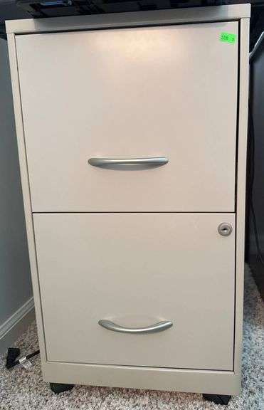 Two-drawer filing cabinet constructed from metal with a beige finish. Features a locking mechanism on the top drawer. Each drawer is designed to accommodate hanging file folders, as shown in the open views. Equipped with smooth casters for mobility. Dimensions: 14.25 x 22 x 26 inches.