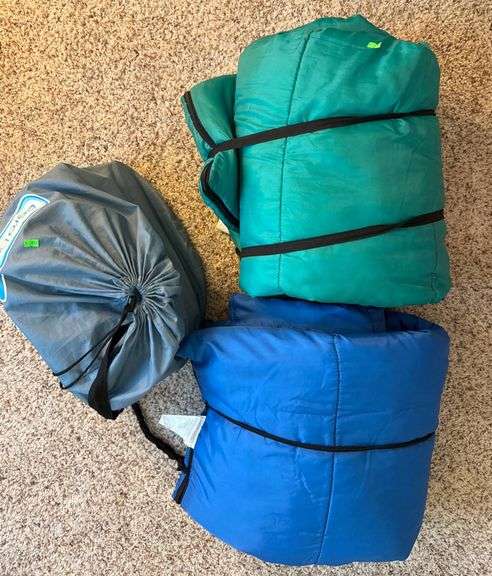 One Aerobed air mattress in its original storage bag with adjustable drawstring closure. Also included are two polyester sleeping bags by Exxel Outdoors (green and blue), each measuring 33 x 75 inches and filled with polyester fiber batting. Both sleeping bags are lightweight at 3 lbs.