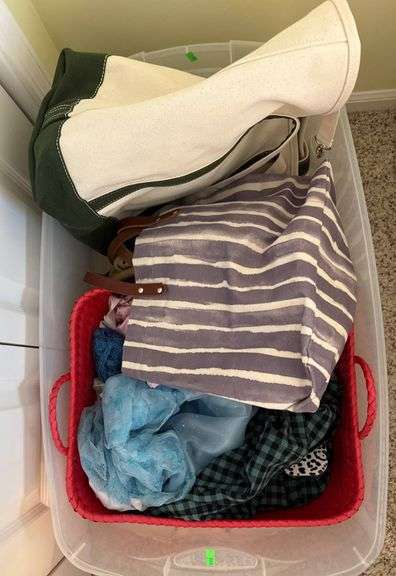 A collection including fabrics in various colors and patterns, sewing patterns for children’s garments (brands include See & Sew and New Look), and several tote bags. Items are contained in a plastic storage bin and accompanying woven basket.