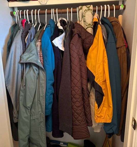 Jackets and outerwear, including quilted coats, fleece pullovers, lightweight raincoats, and vests. Garments are in a variety of materials and colors, featuring both solid and patterned designs. Sizes range from youth medium to adult extra-large. Specific brands and details visible upon closer inspection.
