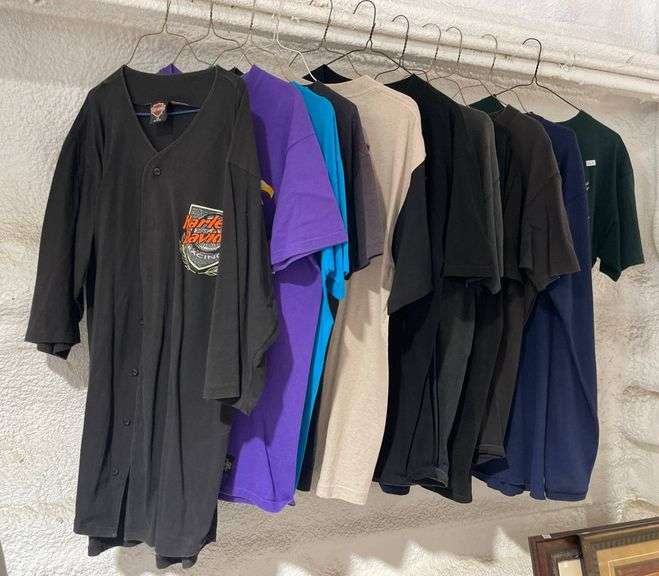 Harley-Davidson graphic t-shirts, featuring various designs including eagles, motorcycles, and themed illustrations. Includes multiple colors such as black, purple, teal, and green.