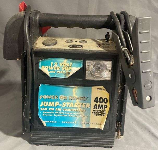 Power On Board portable jump starter and air compressor, model VEC021. Provides 400 Amp instant starting power, with additional features including a 260 PSI air compressor.