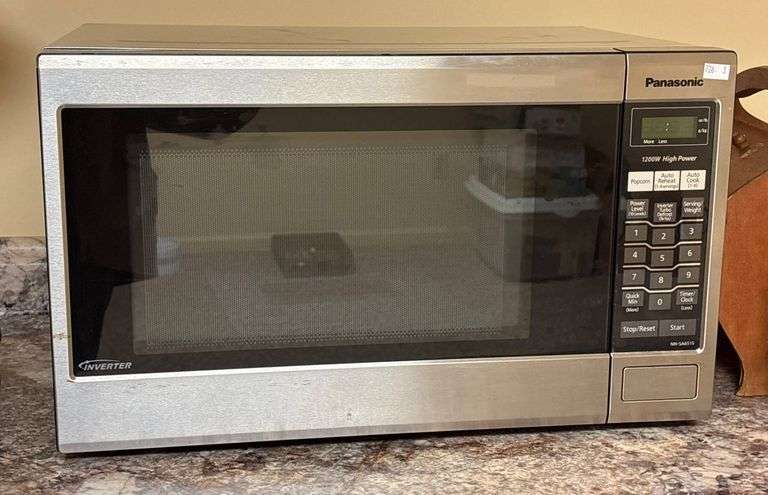 Panasonic countertop microwave model NN-SD681S, featuring Inverter Technology for balanced cooking. Stainless steel exterior with digital control panel, including numerical keypad, preset options, and a digital clock/timer display. Interior capacity suitable for general household use. Dimensions: 20x14x12 inches.