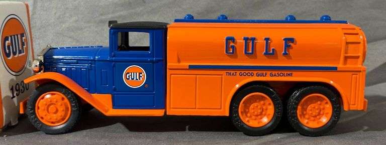 Die-cast model of a 1930 Diamond T fuel tanker by Ertl, featuring Gulf Oil branding in blue and orange color scheme. Measures approximately 8 inches in length. Marked as #2 in a series and designated as a 1994 limited edition. Includes the original illustrated box. Manufactured in China, assembled in the USA. Minimal wear observed on the packaging.