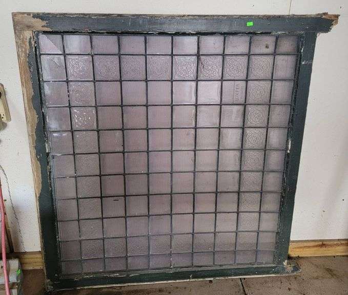 Panel composed of leaded glass tiles set in a wood frame, featuring marked 'Luxfer Patented' tiles. 48 x 47in. The tiles incorporate geometric and ridged patterns. Notable wear to the wood frame and some visible cracks in select glass tiles. Luxfer tiles are recognized for their intricate designs and historic applications in architecture.