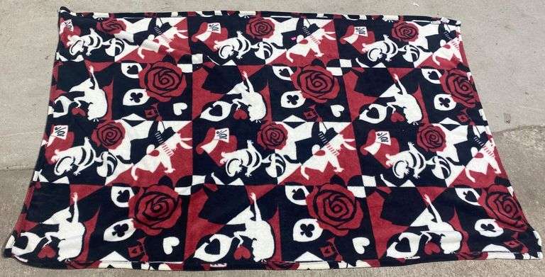 Disney Parks-branded throw blanket designed by Vera Bradley, featuring a bold rose and Mickey Mouse pattern in red, black, and white tones. Made from 100% polyester, this blanket is machine washable and measures 46”x72”.