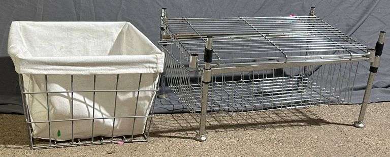Includes a metal wire basket measuring 16” x 12” x 8” with a removable fabric liner labeled ‘Junan Greenway Commodity Co., Ltd’ and a two-tiered chrome storage rack measuring 18” x 14” x 10”. The rack features two stacked wire shelves supported by adjustable poles with stabilizing feet.