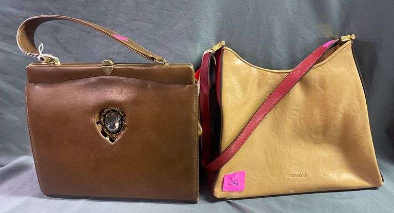 Two handbags. The first is a tan Mondani shoulder bag featuring a crimson strap and embossed branding. The second is a brown Triangle handbag with a top clasp closure and an applied decorative medallion on the front.
