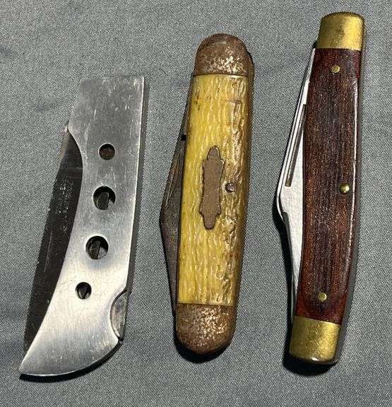 Three folding pocket knives, featuring one stainless steel knife marked ‘Pakistan’ with a single blade and perforated handle, one dual-blade knife with yellow handle and unmarked blades, and one three-blade knife marked ‘Craftsman USA 36111’ with wood and brass accents.