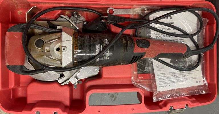 Roberts Longneck Plus 6-inch jamb saw, designed for precision cutting. Includes a red molded carrying case, spare blades, and original owner’s manual. The tool features a black and red handle with a rubber grip and is equipped with a power cable.