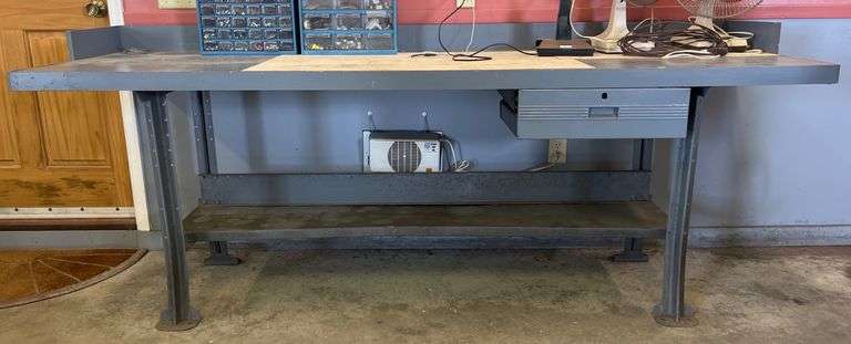 Industrial-style metal workbench featuring a spacious top surface, a single pull-out drawer with a recessed handle, and a sturdy lower shelf for additional storage. Dimensions are 98×31.5×38.5 inches. Includes a backstop on three sides.