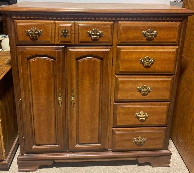 Chest of drawers featuring 7 drawers with brass pulls and a central cabinet with dual doors and additional interior shelving. Top edge includes a carved detail. Made of stained wood with natural grain visible. Drawers show dovetail construction.