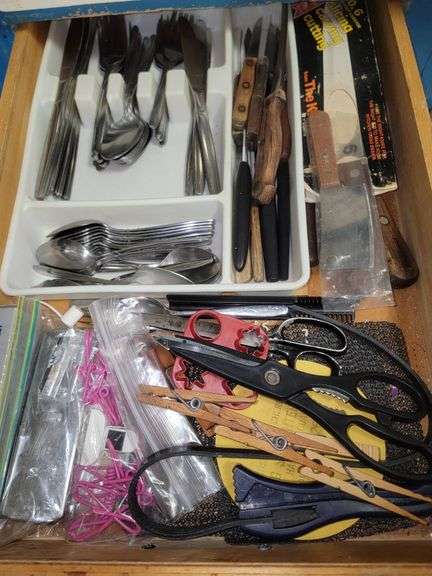 Collection includes assorted kitchen utensils, such as stainless steel forks, knives, and spoons stored in a compartmentalized tray, as well as wooden-handled knives and larger serving utensils. Additional items include scissors, can opener, screwdriver set, clothes pins, and various small tools in a drawer.