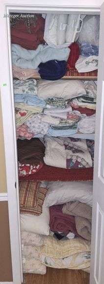 Household textiles stored in a closet, consisting of comforters, blankets, pillows, and linens in various colors, patterns, and materials. Items appear folded and arranged on multiple shelves. Specific materials, dimensions, and quantities vary.