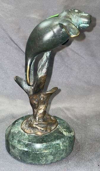 Metal statuette depicting a manatee, mounted on a polished green marble base. Statuette measures 6″H and features a naturalistic design. Base underside includes a sticker marked “San Pacific Int’l, San Francisco, USA, Made in China.”