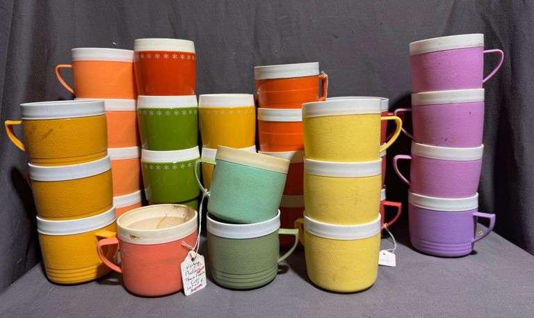 Bolero and Sunfrost Therm-O-Ware cups in multicolor designs. Includes (24) cups with measurements of 3×3.25 inches and (5) taller cups with measurements of 5.5×3 inches. Made from durable, lightweight plastic, featuring integrated handles and various textured and smooth finishes.