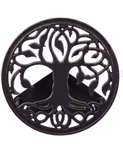 Liberty Garden Products metal hose hanger in a Tree of Life design, dimensions are approximately 12”Round x 6” Deep