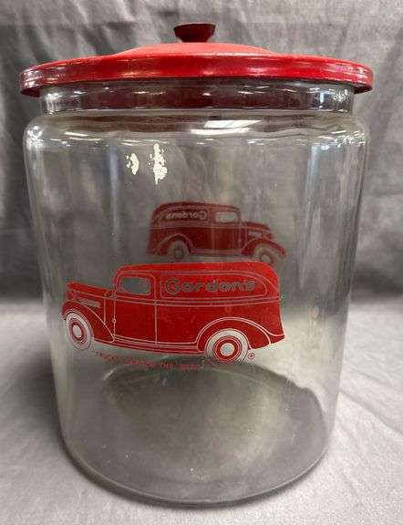 Clear glass jar with a red metal lid and a central knob handle. Decorated on the exterior with red Gordons truck graphics on multiple sides. The jar measures approximately 10.5” in height and 9” in diameter. The lid shows light wear consistent with use. Both the glass body and graphics appear intact, with some minor surface wear noted.