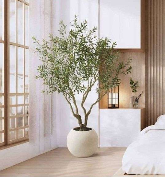 CGH artificial olive tree measuring 8 ft tall, featuring detailed lifelike leaves with small olives. Includes a round white pot.