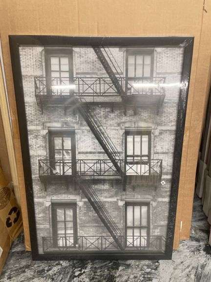 Framed black-and-white photographic print depicting the exterior facade of an urban building featuring multiple windows and a fire escape. The frame is constructed of black material and is fitted with a backing board that includes attached hardware for hanging. The print appears to retain protective wrapping, suggesting unused condition. Additional labels and instructions are affixed to the back.