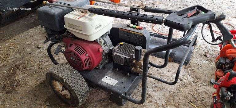 Honda GX390 pressure washer featuring a 13.0 HP motor and steel frame construction. Equipped with pneumatic tires for mobility and a reinforced handle for stability. Includes nozzles.