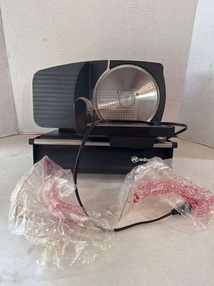 Adortec model ASL1023 electric food slicer with a 120W motor. Features a circular stainless steel blade, adjustable slicing thickness, and compact design. Made of plastic and metal components, it includes a clear safety guard and a textured food pusher. The slicer is intended for household use and includes a power cord.