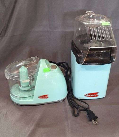 Americana Mini Chopper (Model EWC-001BL) and Americana Popcorn Maker (Model EPM-100BL) in a coordinated light blue finish. The mini chopper features a clear lid and blade base powered at 120V, 60Hz, 30W.