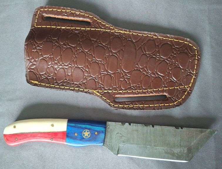 LOT 121 - Red, White & Blue Wood Handled Damascus Steel Blade Knife in Brown Sheath 4" Blade
