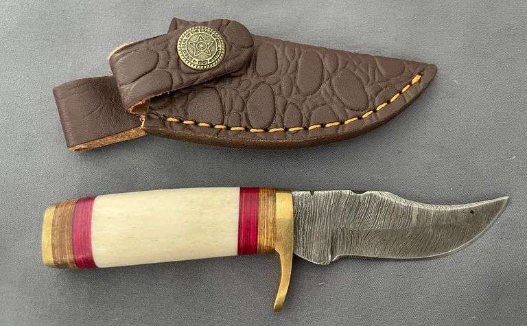 LOT 119 - Damascus  steel blade knife with white/red wood handle & Sheath, 3” blade
